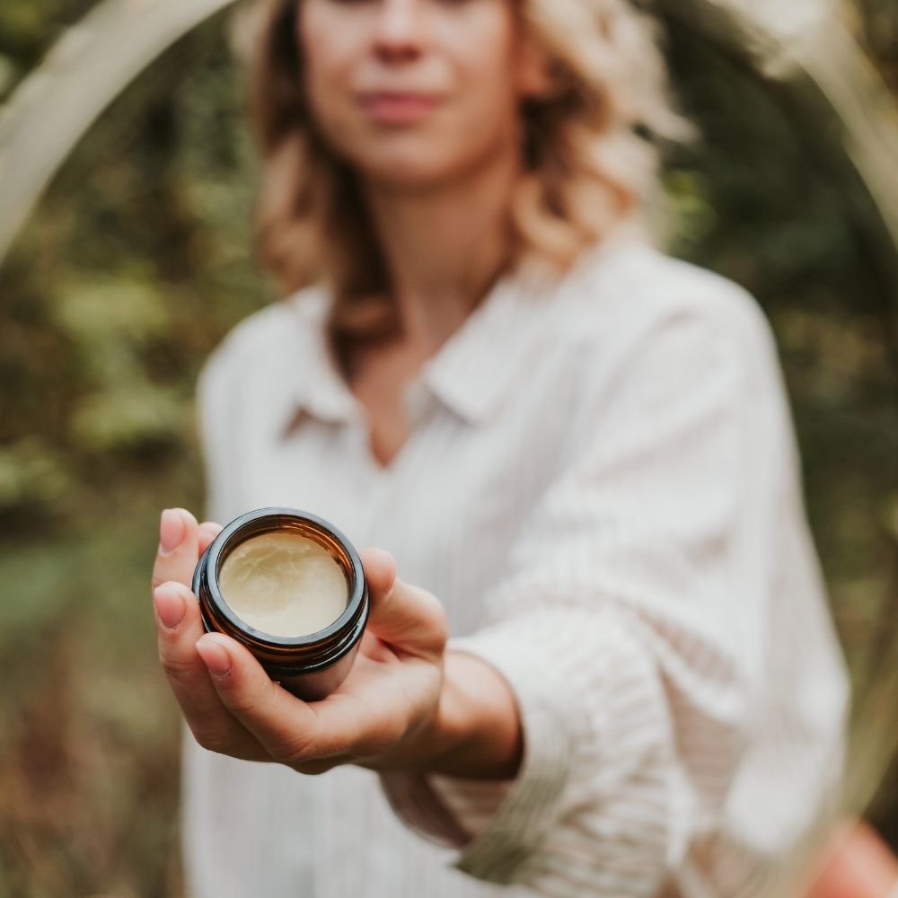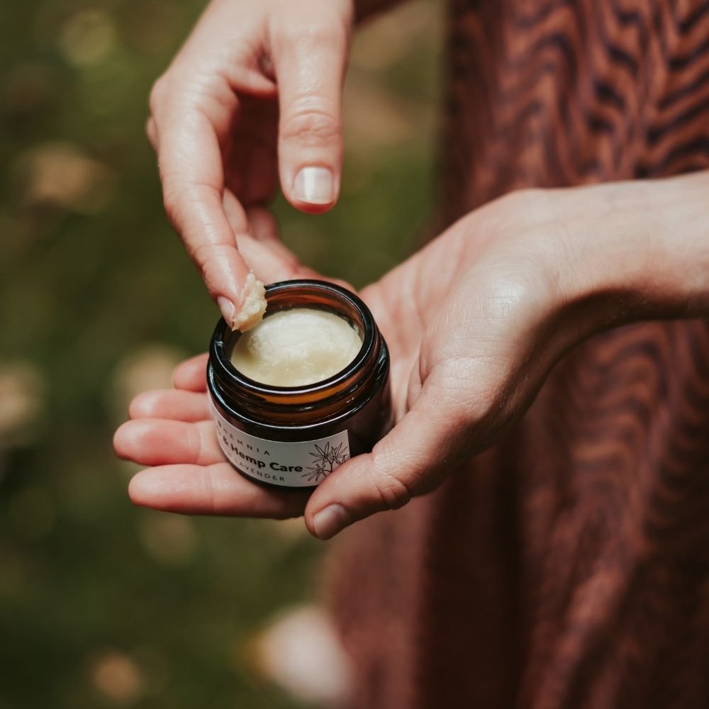 Bálsamo con base de aceite de semillas de cáñamo y CBD, combinado con manteca de mango, aceite de pepitas de uva, cera de abeja y vitamina E.