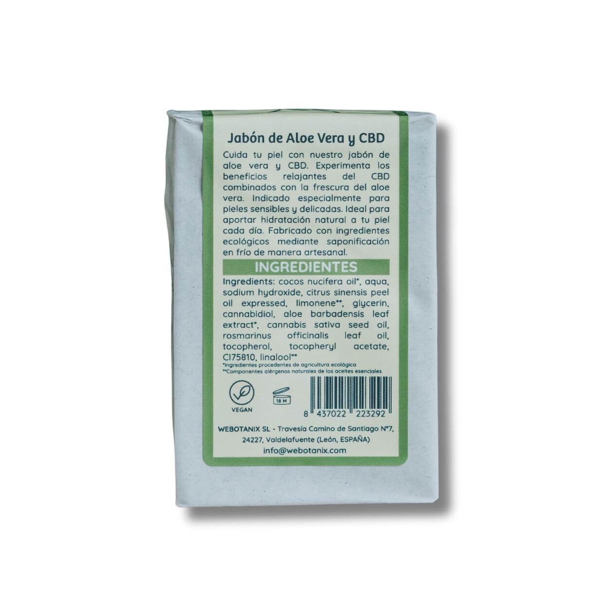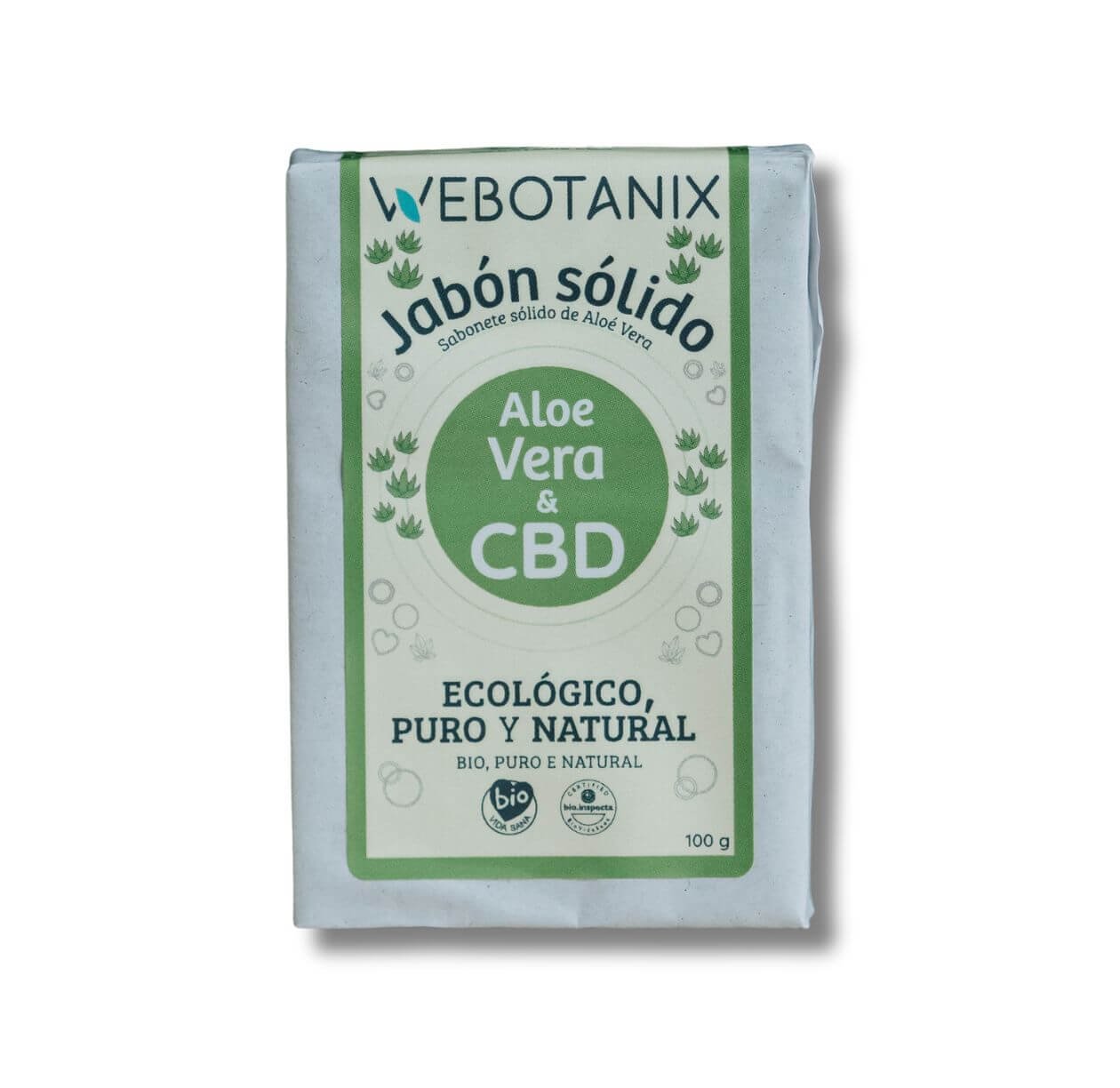 Jabón sólido artesanal elaborado mediante saponificación en frío con ingredientes ecológicos. Su fórmula combina aloe vera y CBD para limpiar la piel de forma suave, respetando su equilibrio natural y aportando hidratación y confort en el uso diario.
