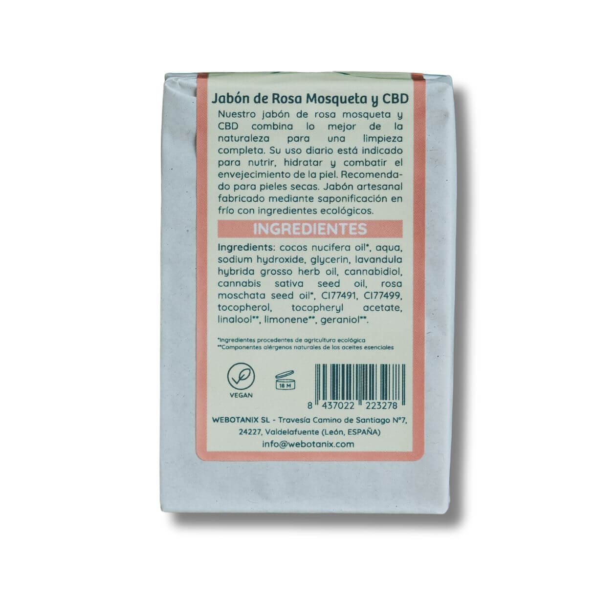 Jabón sólido artesanal elaborado mediante saponificación en frío con ingredientes ecológicos. Su fórmula con rosa mosqueta y CBD limpia la piel respetando su equilibrio natural, aportando nutrición e hidratación en el uso diario.